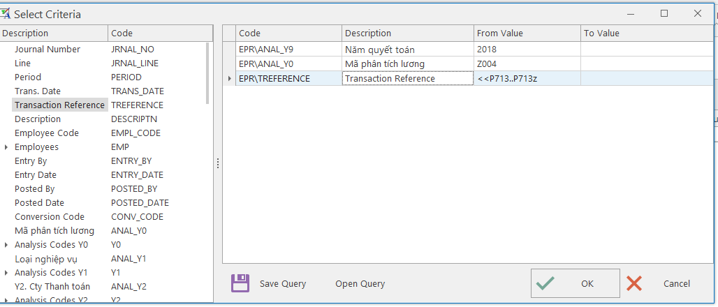 B2: QUERY theo các tiêu chí: Mã phân tích lương (AnalY0), Năm quyết toán (AnalY9) và số chứng từ (Reference).