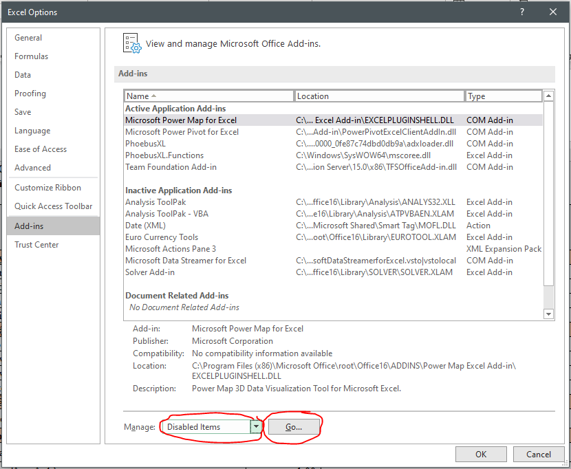 Loại bỏ Phoebus XL khỏi danh sách Disable Items của excel.