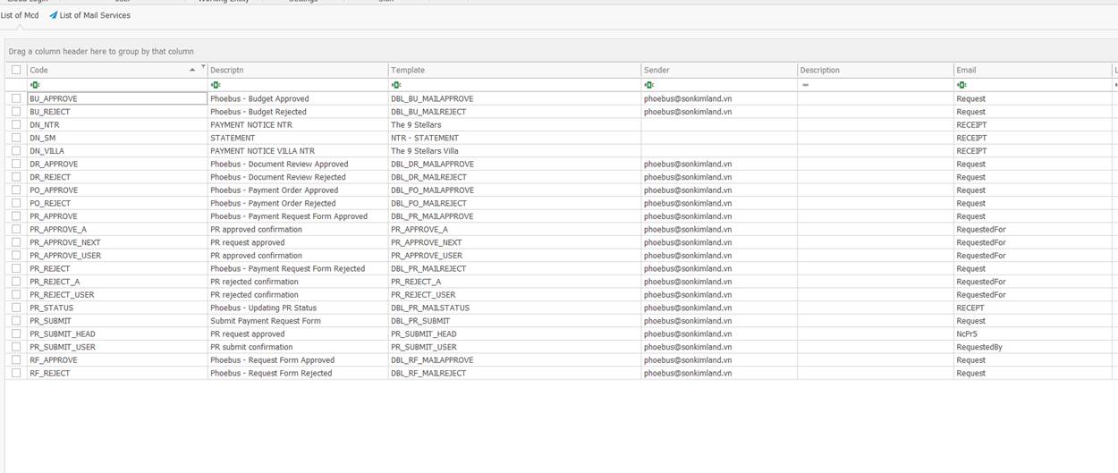 1. Copy Mail service này thành 1 Code mới (ví dụ code là WFMAIL) -> lưu ý cần test mail service thành công