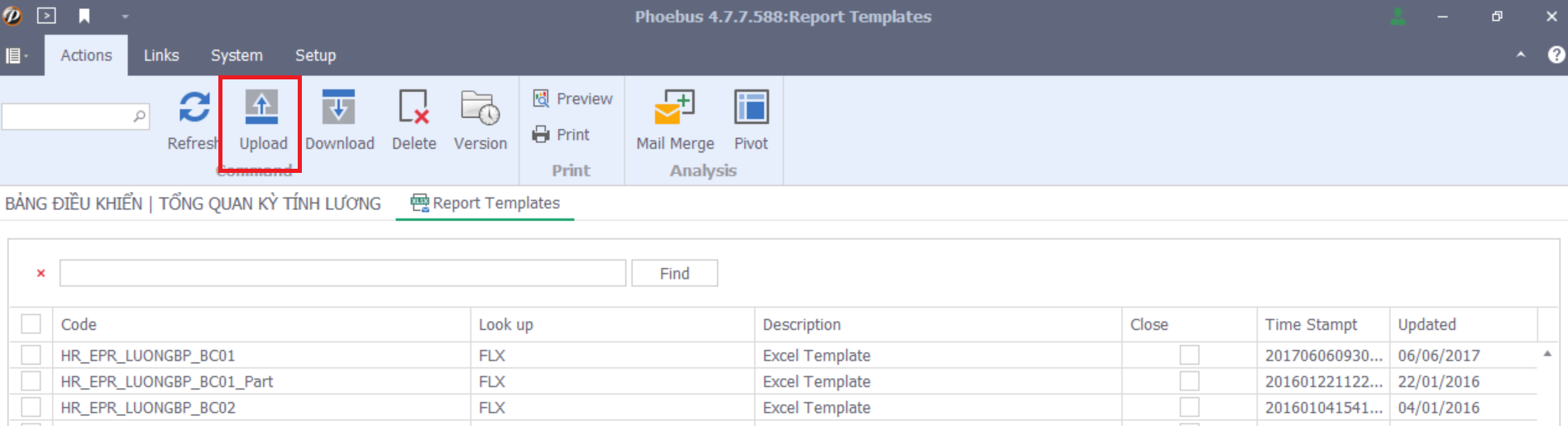 B4. Upload file lên hệ thống, bằng cách gõ lệnh pbs.BO.Report.Templates vào ô lệnh (xem ảnh minh hoạ) -> enter