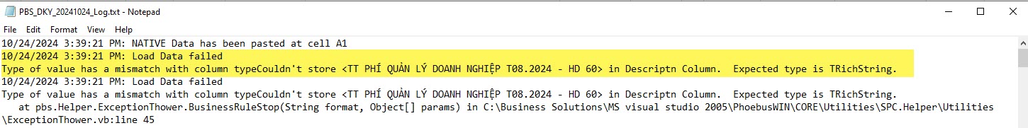 - Hệ thống sẽ báo lỗi khi Import: Couldn't store <...> in Descriptn Column. Expected type is TrichString.