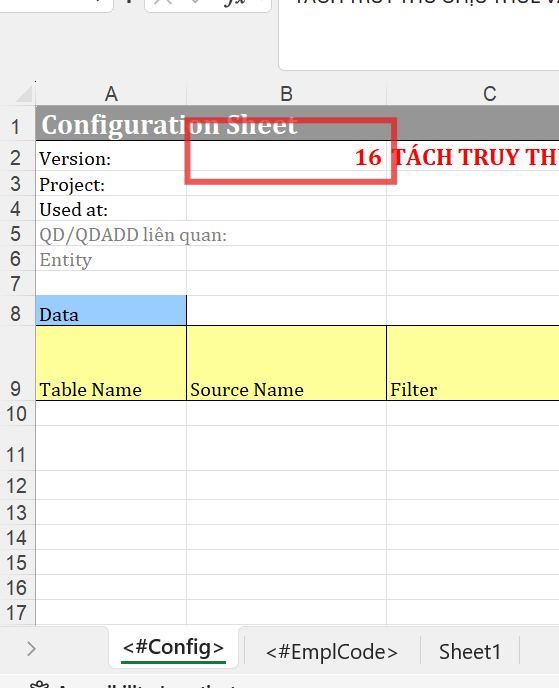 Bước 4: Tăng số version tại ô B2 Sheet <#Config> lên +1 đơn vị. (xem ảnh minh họa)